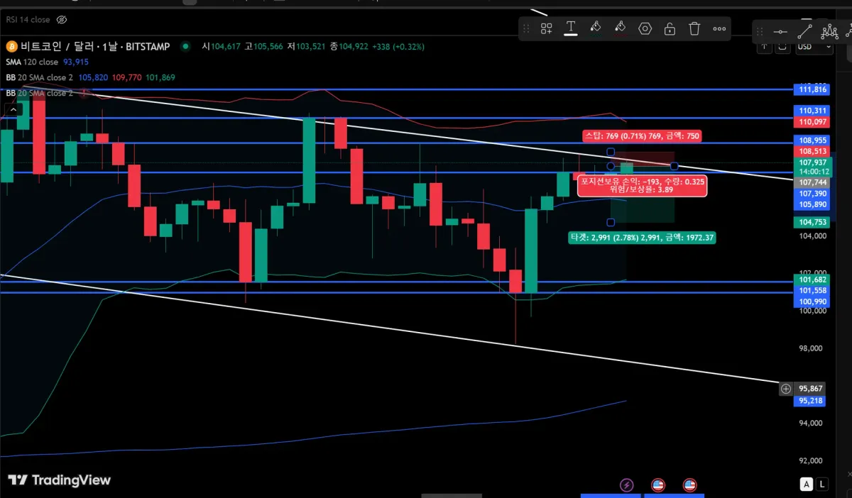 2. 20% 스탑로스로 레버리지 설정하고(이거는 오히려 크게 고민이 안되는 문제네요) 104까지 내려오면 반익절 하겠습니다.(추세선 폭이 워낙 커서 104까지도 올지 모르겠습니다.)