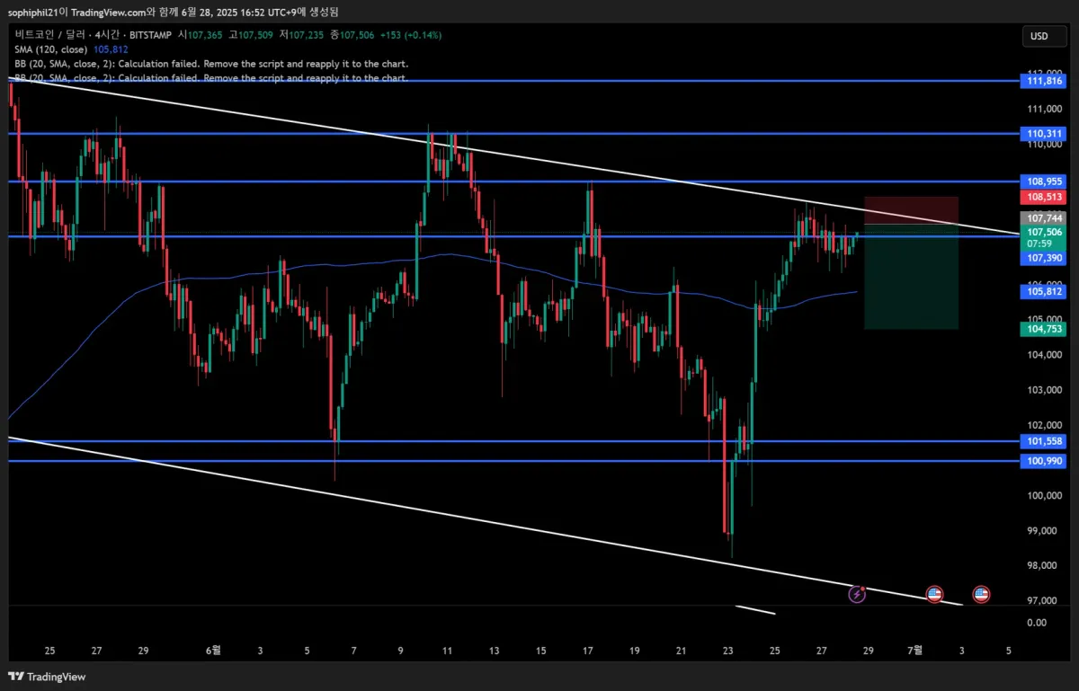 3. 107.505에 수평선과, 그 위에 추세선이 있어서, 세력이 개입하지 않는 한 뚫을 확률이 상대적으로 더 낮다고 생각합니다.