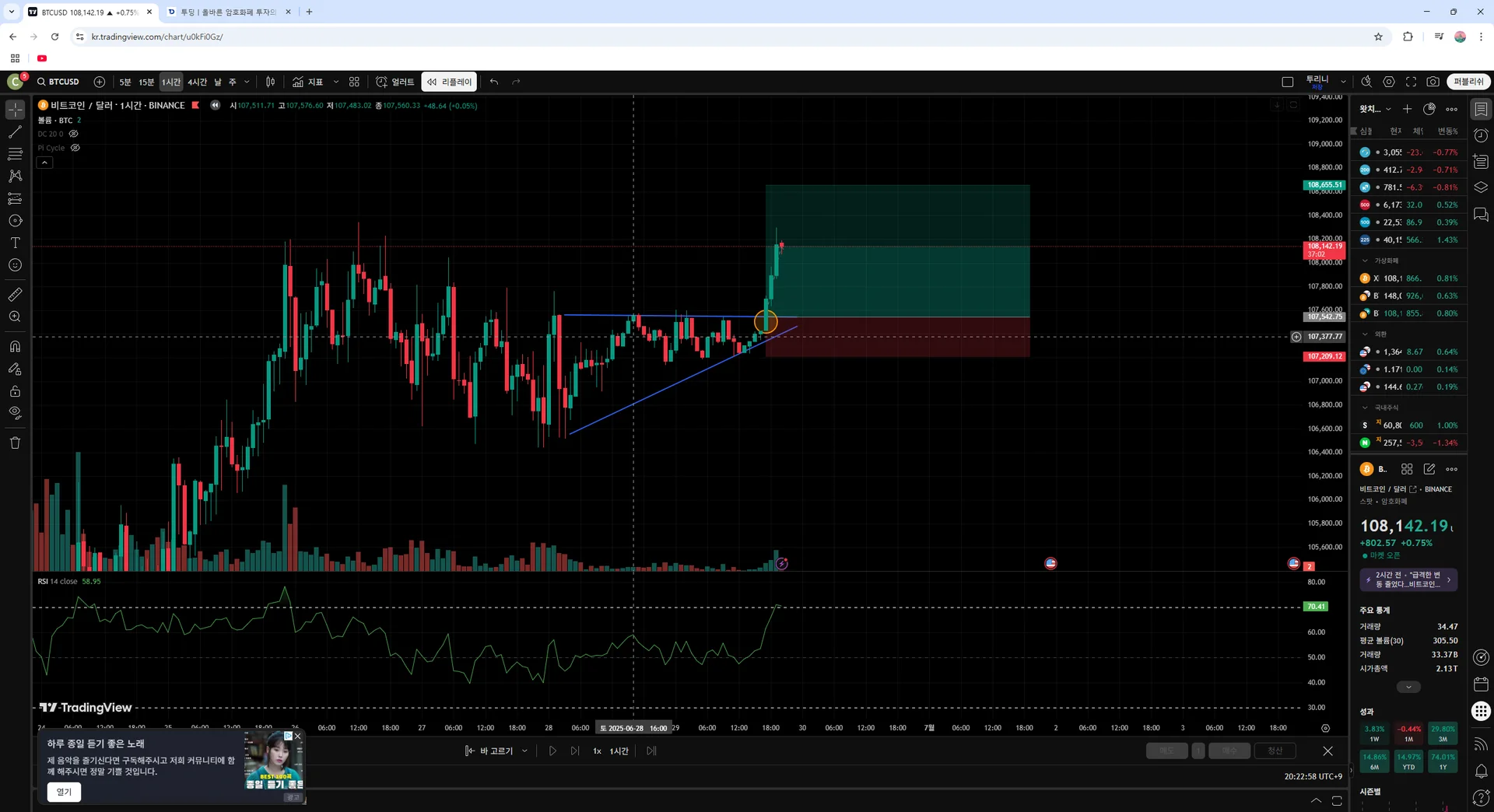 어센딩 트라이앵글 패턴을 사용하여 저항선을 뚫을 것 같아서 저항선을 건드릴 때 진입하려고 하였습니다. 강의에서는 건드리고 나서 진입하라는 말을 들었던 것 같네요