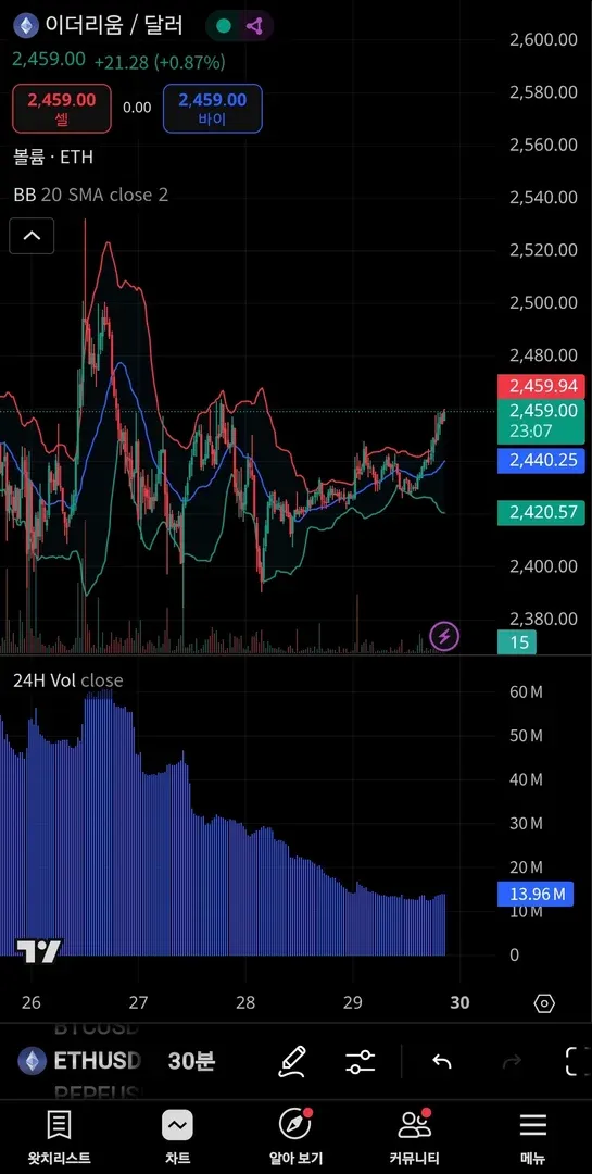 볼린저밴드가 시각적으로 보기 쉬워서 많이 사용하고 있습니다.