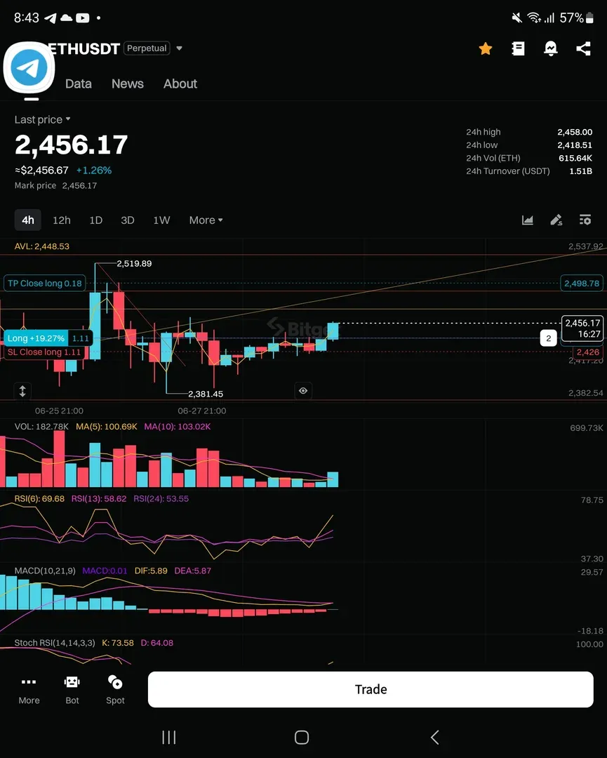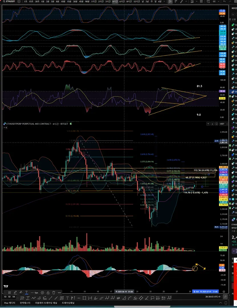 4시간봉 rsi 3바닥만들면서 5시에 4시간봉 양봉이 전 캔들들으 ㅣ중간 도지몸통을 다 감싸는 마감을 하여 상향으로 움직일 추세확률이 높은것확인, -> 이때 macd양선에서 음히스토약해지며 골든크로스 나오려하는 부분으로 더 상승하는 양히스토가 나올경우 하락을위해서는 더높은 고점을 가야 하락가능한부분이라 판단, 1차 목표가는 직전 고점 2469정도이지만, 하락에서 추세반전을 위해서 최소 전체 하락의 618되돌림 부근 지지저항 부근대를 목표로 할수 있을거같다 생각하여 부분익절 목표가를 설정했습니다.