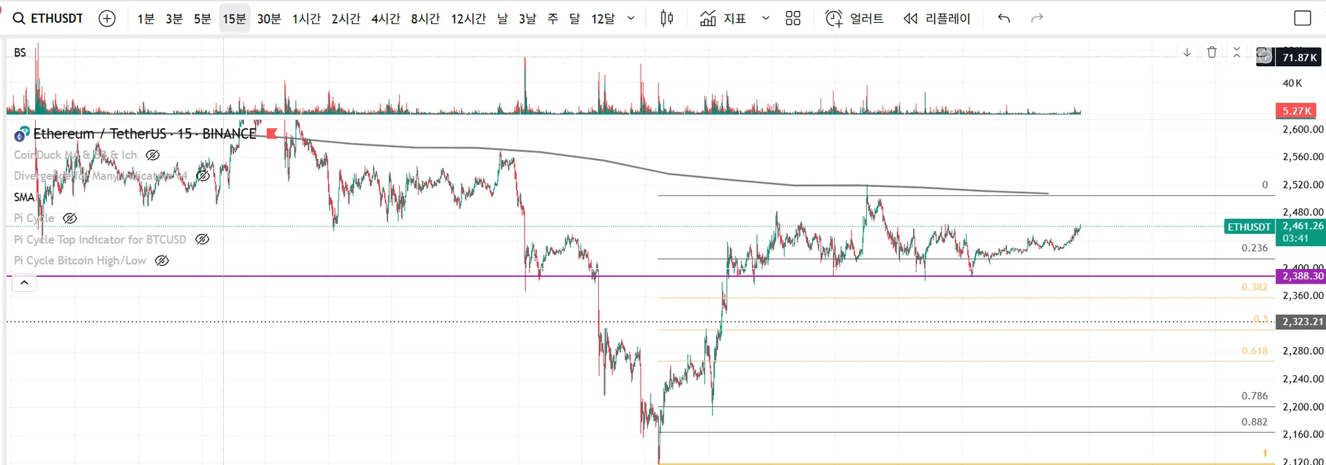 수평지지선과 피보나치 되돌림이 중첩되는 2400 내외에서 진입함