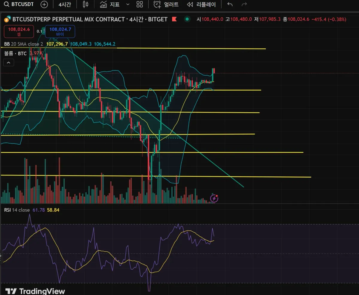 고점 지지선을 지나 더 올라갈것같은 예측, 하지만 너무 오른 상태에서 매수를 해서 다소 불안정함, 처음에는 수익인것처럼 보이나 -0.01%손익비를 계산을 제대로 못함.