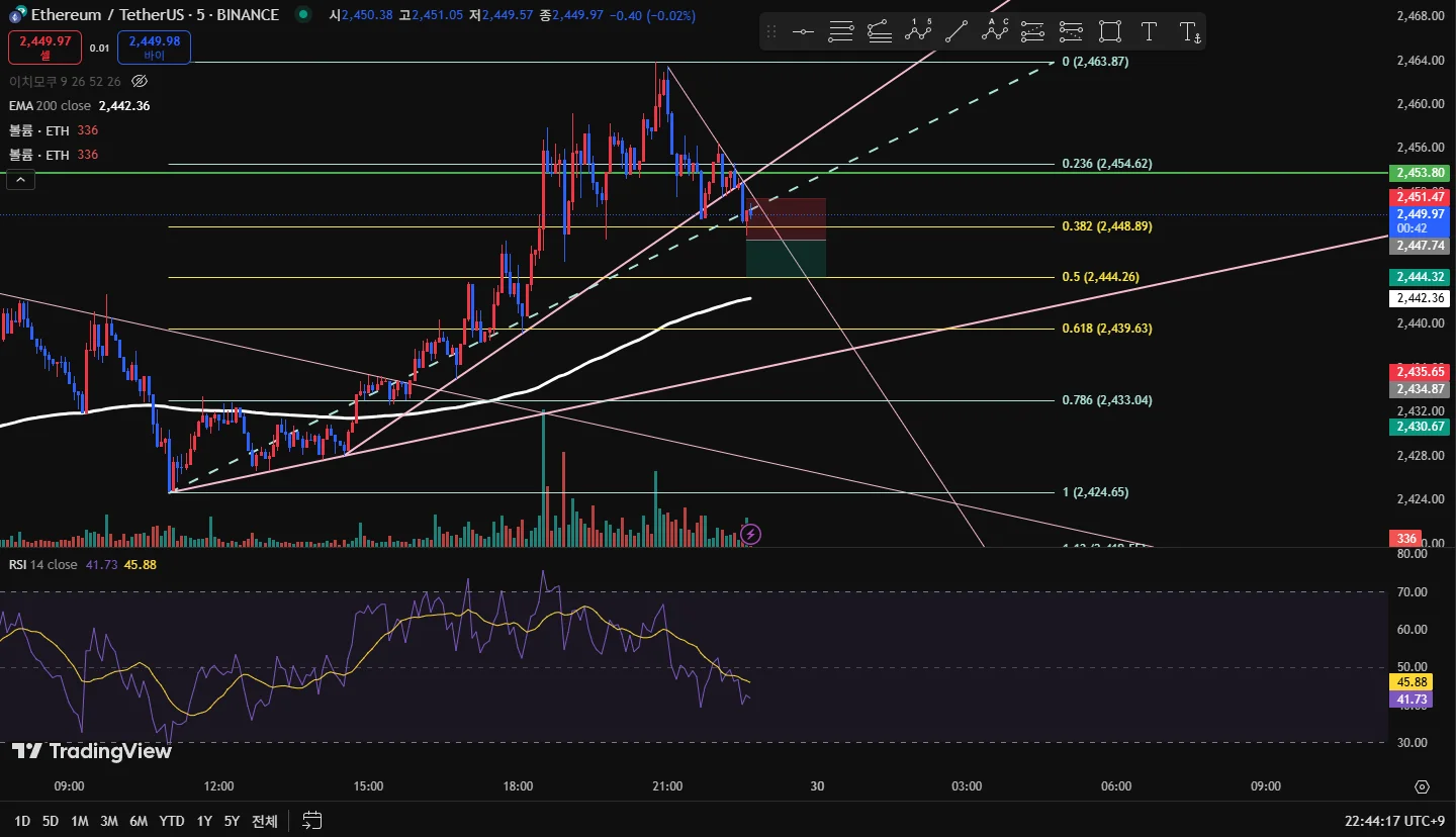- 또한 피보나치 0.5값 바로 밑에 주요 저항선이 되었던 라인이 존재하므로 좋은 손익비를 가져가지 못함. (피보나치 0.5 값 또는 저항선이 지지선으로 작용할 수 있을거란 생각)