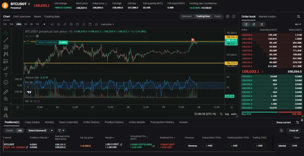 오랜 시간 횡보 하다가 박스권 상단과 볼린져밴드 상단에 도달하여 단기 고점이라 생각하고 숏을 들어갔다. 하지만 상단에서 생각보다 오래 횡보하고 볼린져밴드 중단 까지 도달하였기 때문에 약익절 하였다.