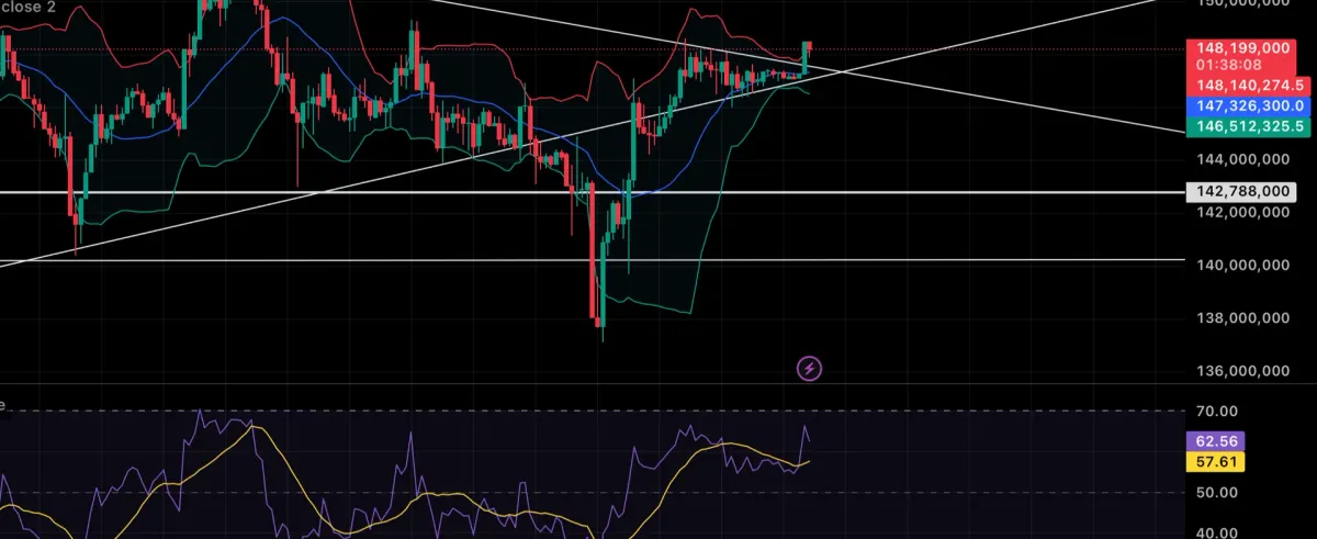 삼각수렴 패턴으로 보고 상방돌파때 진입했는데, 아직 리테스트 구간일 수 있어서 조금 불안하긴합니다 ㅠㅠ