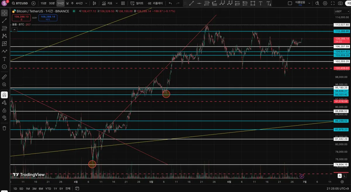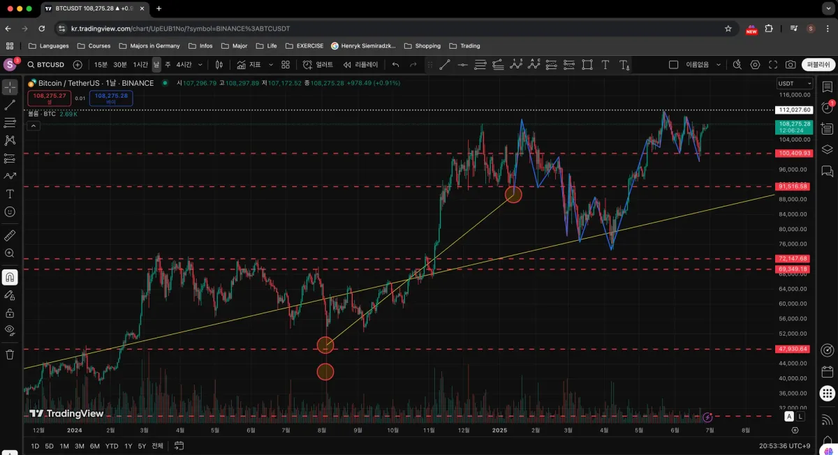 2025년 6월 29일 일봉으로 강의를 보고 최대한 분석해봤습니다. (1. 지지저항선 2. 추세선 3. 다우이론) + 거래량 참고