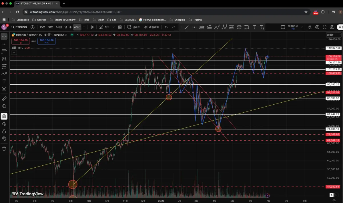 4시간봉으로 와서 다시 차례대로 1. 지지저항선 2. 추세선 보정 3. 다우이론 + 거래량 참고하였고