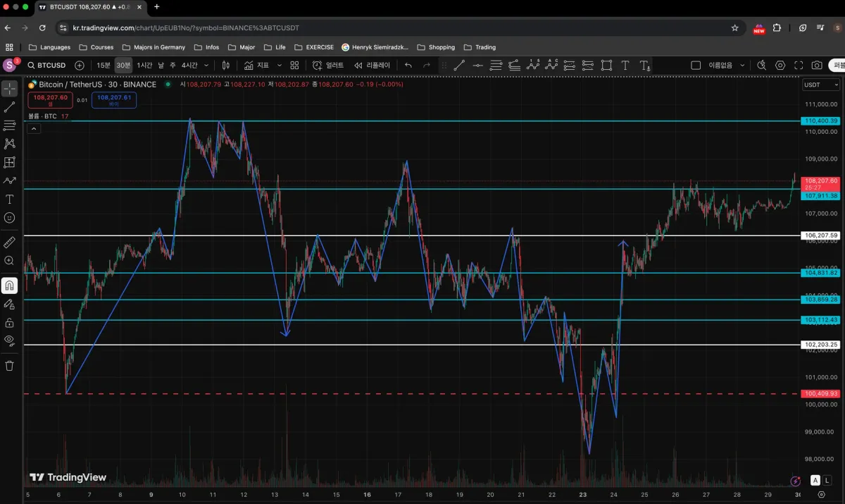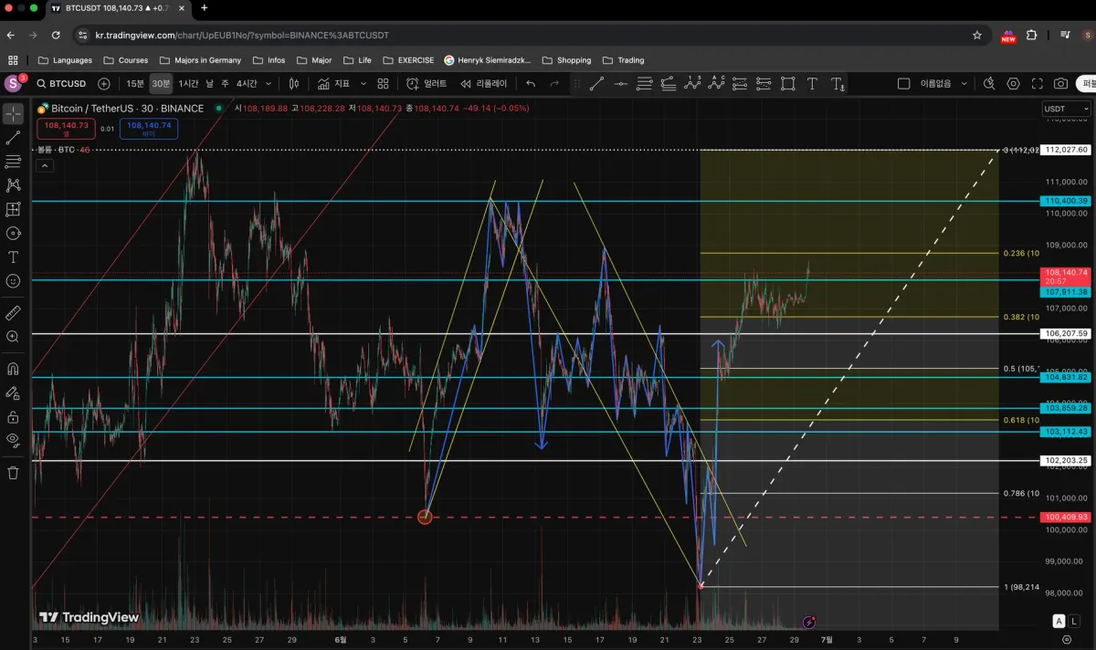 30분봉에서 작도를 해봤습니다. 그 후 모의매매를 위해 진입 포지션을 찾기 위해서 피보나치를 사용했고 최저점과 최고점을 기준으로 진입 포지션을 찾아보려 노력했으나 손익비 분류를 하는것이 아직 이해가 가지 않았고 분석을 통한 논리와 결정의 근거가 되는 이유를 찾아내지 못해 매매를 결국엔 하지 못했습니다.