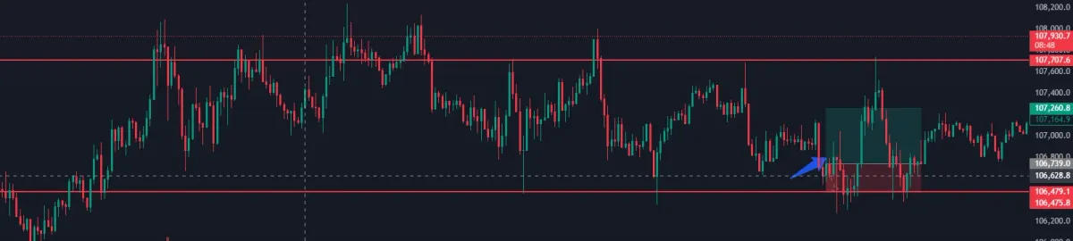 1. 금요일 하루종일 차트를 보면서 횡보한다는 느낌을 많이 받았고, [106.2k~106.4k]~[107.7k ~108k] 사이에서 움직이고 있었습니다.
