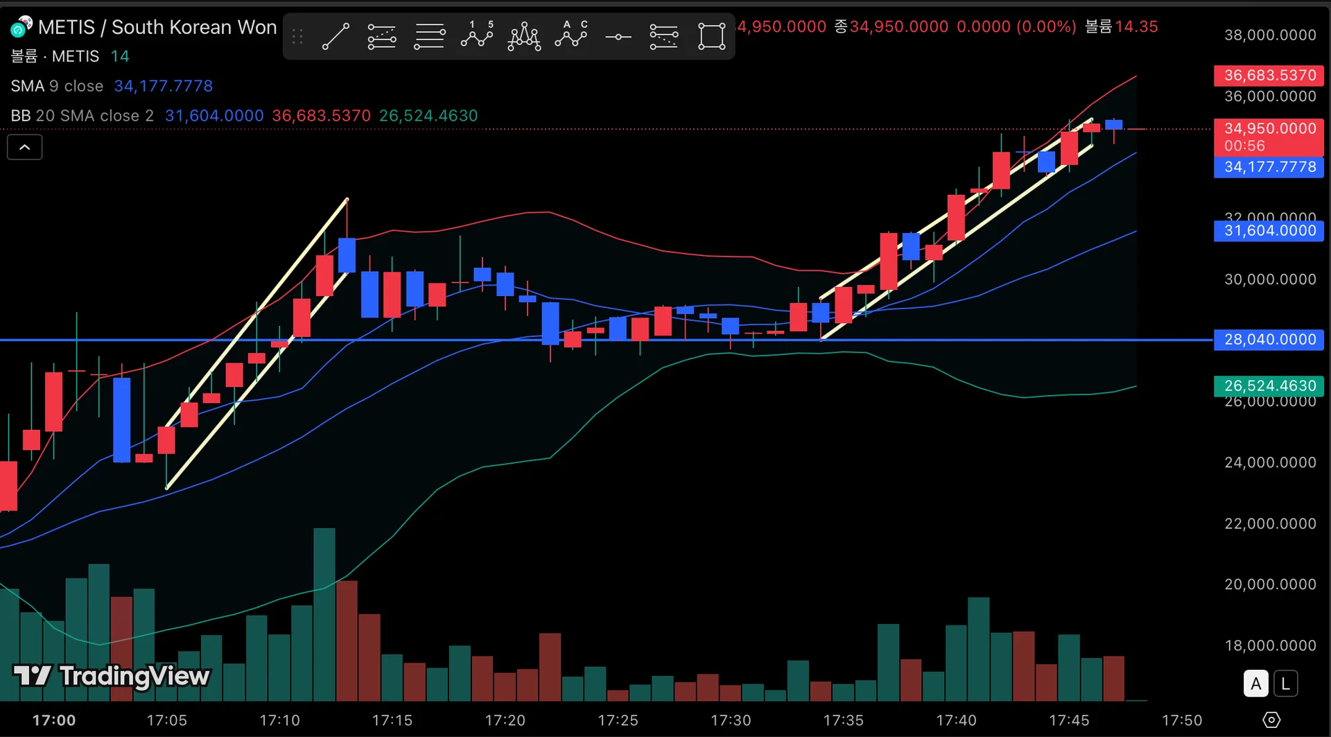 단타로 해보겠다는 생각에 1분봉으로 보고 추세선을 그려 상승장일 때 진입 후, 매매하였습니다.