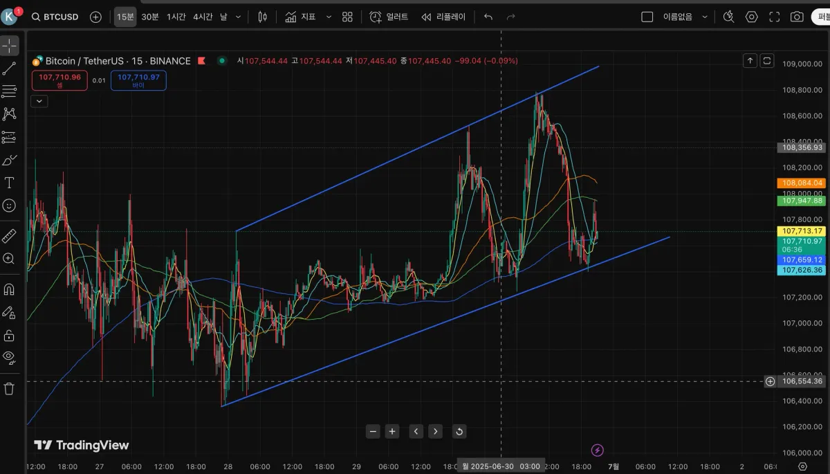 추세선 그어놓고 하방에서 롱 진입 후 상방도달까지 대기 중입니다