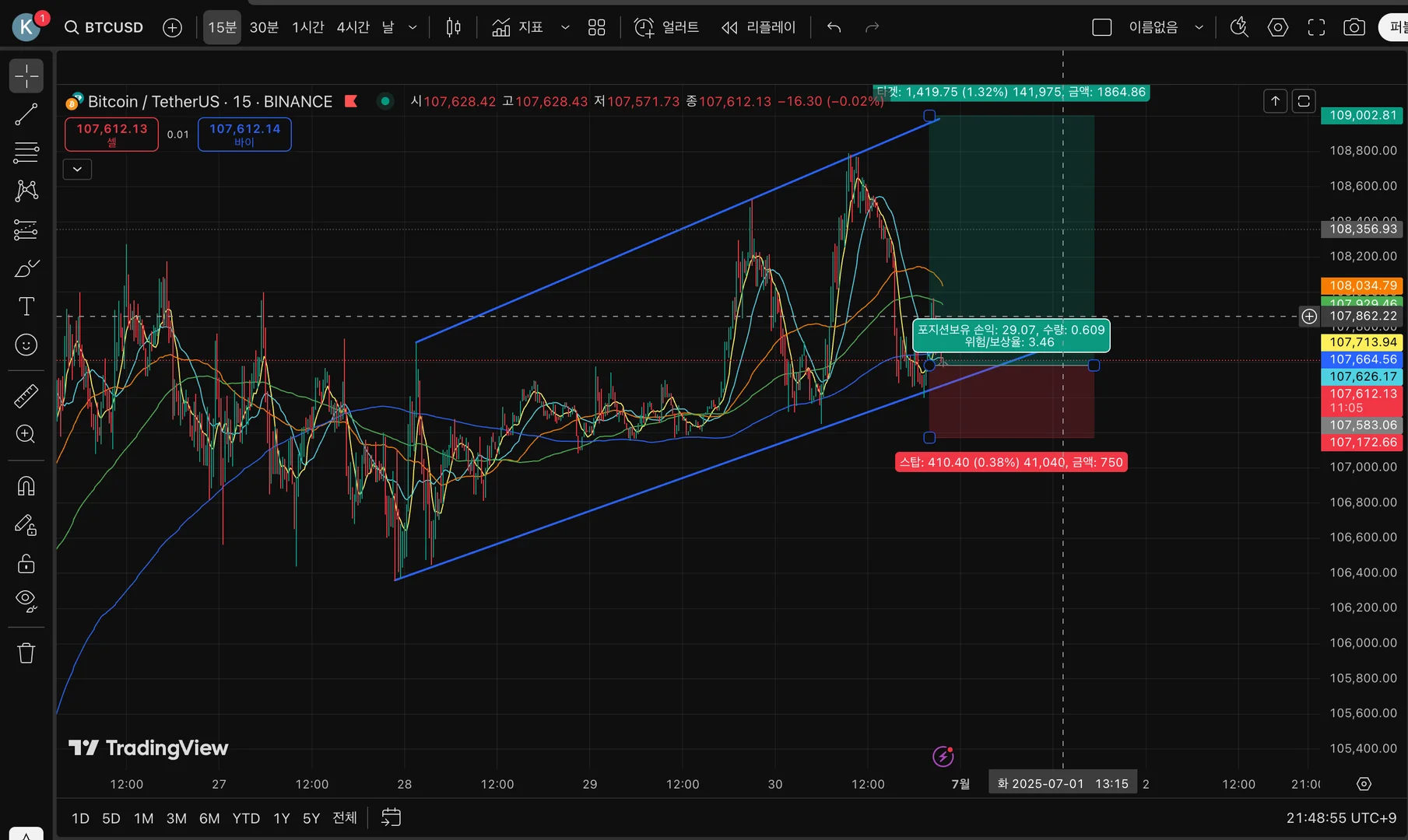 추세선으로 박스권 형성 후 하단에서 롱 진입 후 대기중