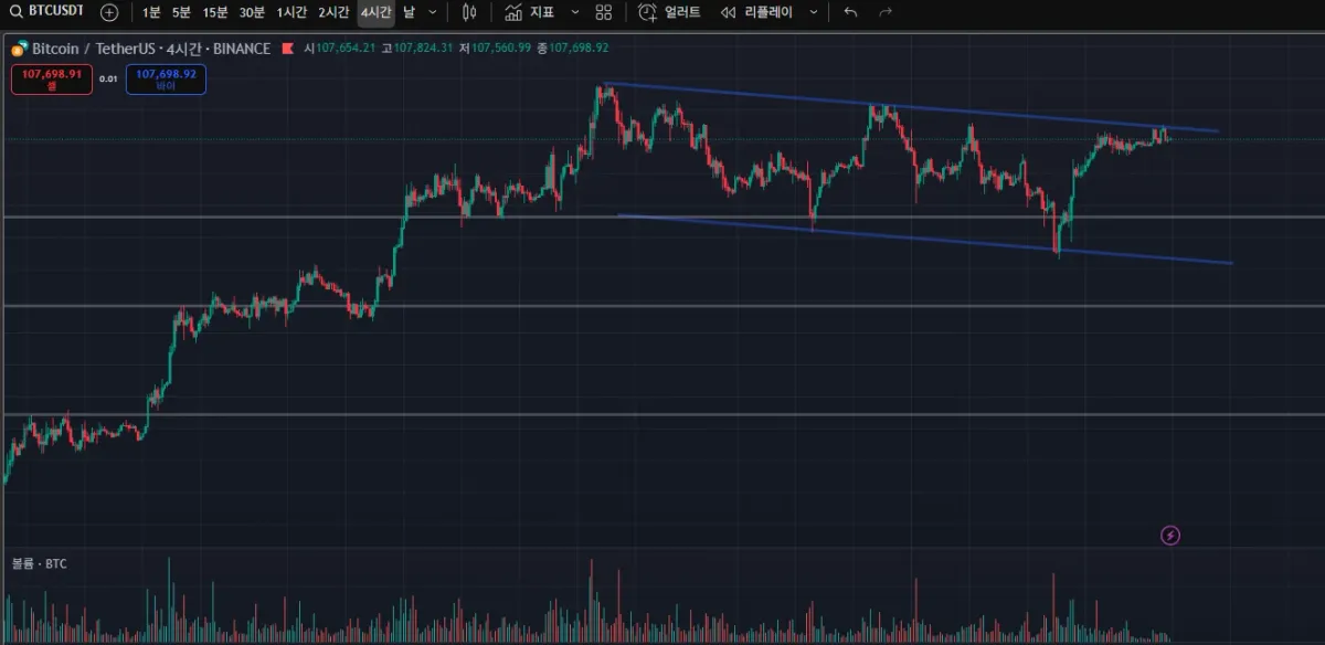 현재 4시간봉 기준으로 추세선과 지지선을 표시하였습니다.