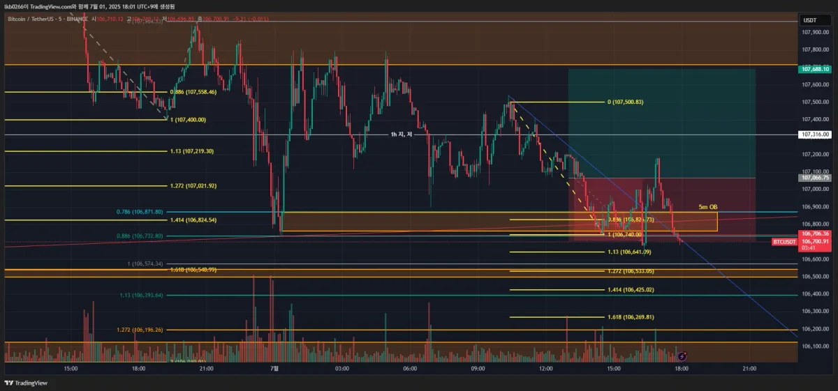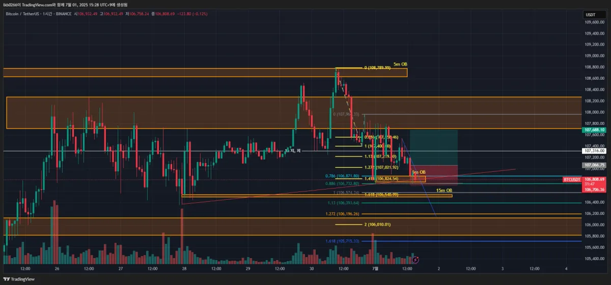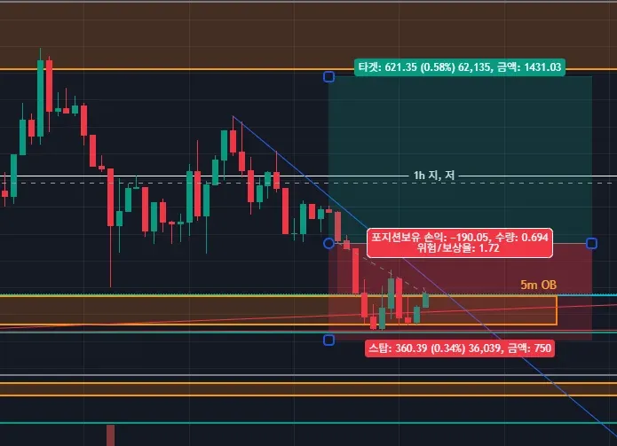 -큰 프레임 4시간 봉 으로는 고점 갱신 못하고 5m OB 맞고 큰 하락하였음. 큰 프레임으로 고점은 109k, 저점은 98.2k여서 큰 프레임으로 보면 안되겠다 생각.