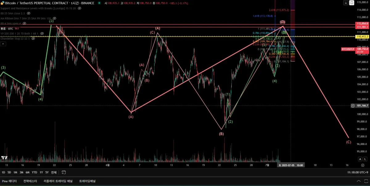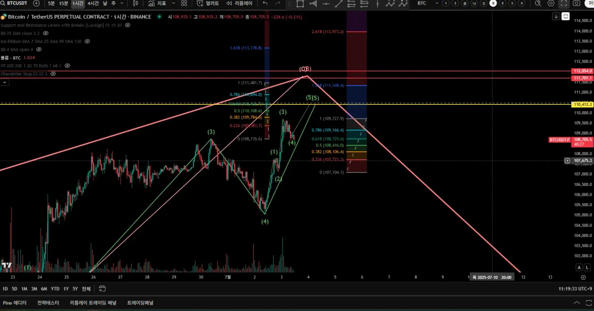 어제부터의 하락을 미세4파로 보고, 미세4파가 미세3파의 0.618부근에서 지지를 받아 소량 롱 진입했습니다.