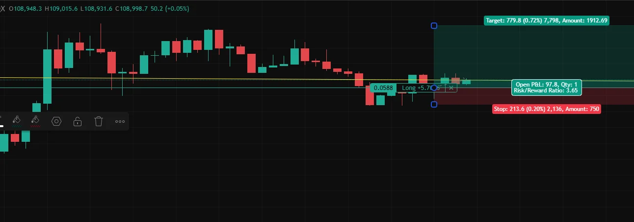 15분봉 기준으로 RSI 과매도, 지지라인 108672를 몇번 찍고 반등하는 모습을 보여서 롱 포지션 진입, 결과적으로는 지지라인 이탈, 스탑로스를 걸어놓지 않아, -1%로에서 끝났을걸 -1.4%로에 손실확정.