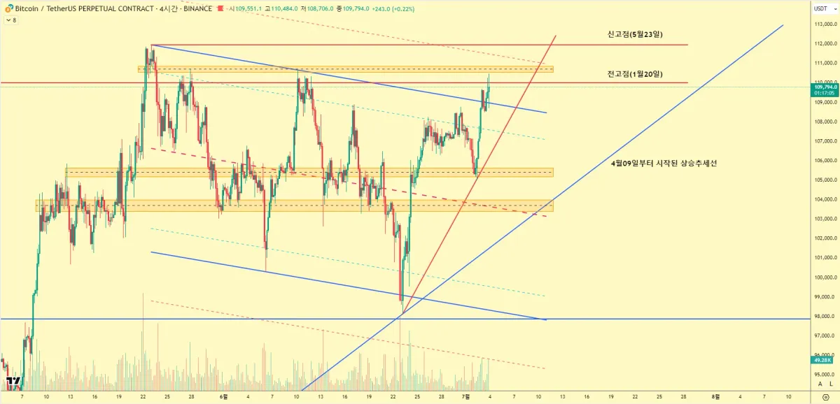 수평 지지 저항은 거래량이 붙는 구간에서 잡아봄. 추세선 작도는 시간의 흐름에 따라 갱신.