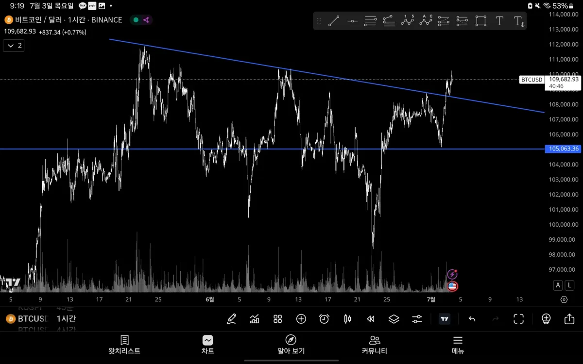 7일 챌린지[30일 챌린지 34기 1주차] BTCUSDT 1시간봉 지지저항과 추세선 작도 실습