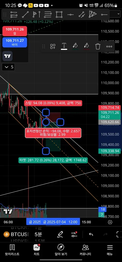 채널 하단과 상단에서 가격거부반응이 지속되어서 상단선 도달했을때 손절을 전저점 두고 들어갔으나 봉마감 5초전에 진입했어야하는데 무지성으로 자리만보고 들어가서 손절맞음.