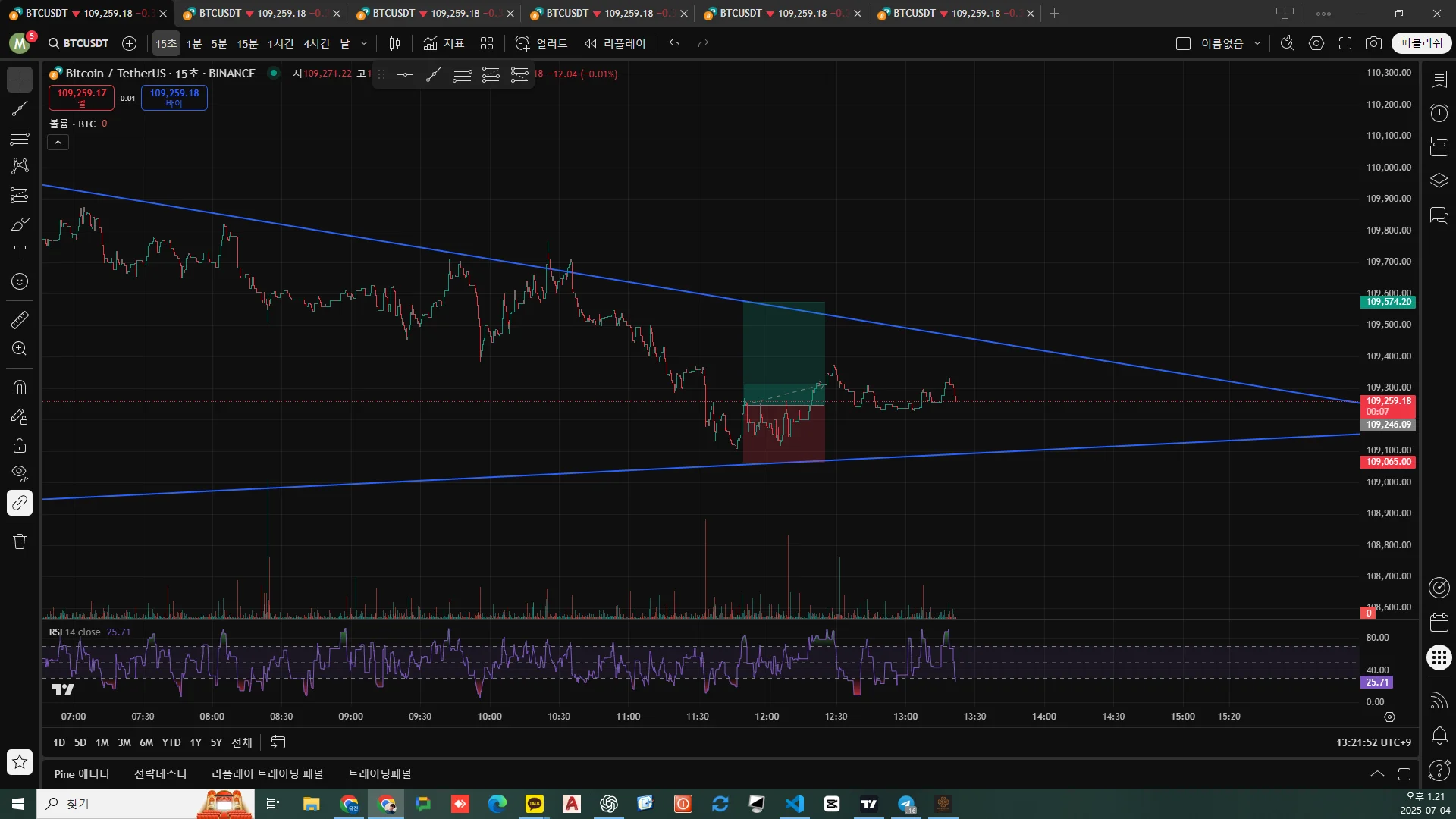 위쪽 파란라인을 터치하는 것을 익절라인으로 잡고 하방 지지를 손절라인으로 포지션 집입했습니다.