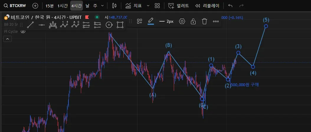 ABC 조정을 거쳐 다시 상승 추세로 가고 있으며 엘리어트 파동을 진행 중에 있다 생각하여 145,000,000에 50만원 구매 걸어두었고, 성공함!!