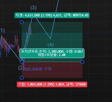 현재 3파동을 향해 가고 있다고 생각하고 5파동을 어디로 잡아야 할지 고민하였다가 3파동의 꼭대기라 생각되는 지점인 150,000,000에 분할매매를 진행해 볼 생각임.