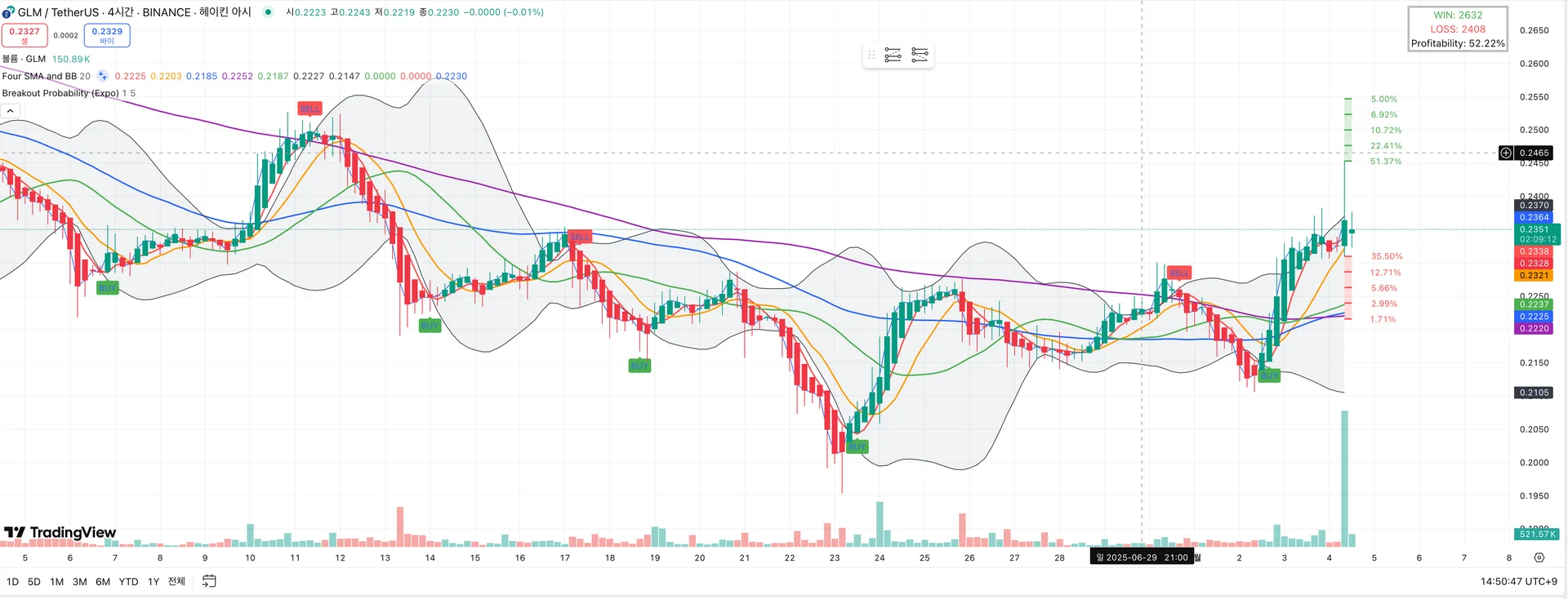 최근 캔들에서 강한 상승 신호가 나타났고, 상단 볼린저 밴드를 돌파했다는 점은 분명 주목할 만하다. 기술적으로 보면, 이런 돌파는 단기 상승 모멘텀의 분출 신호로 해석될 수 있다.