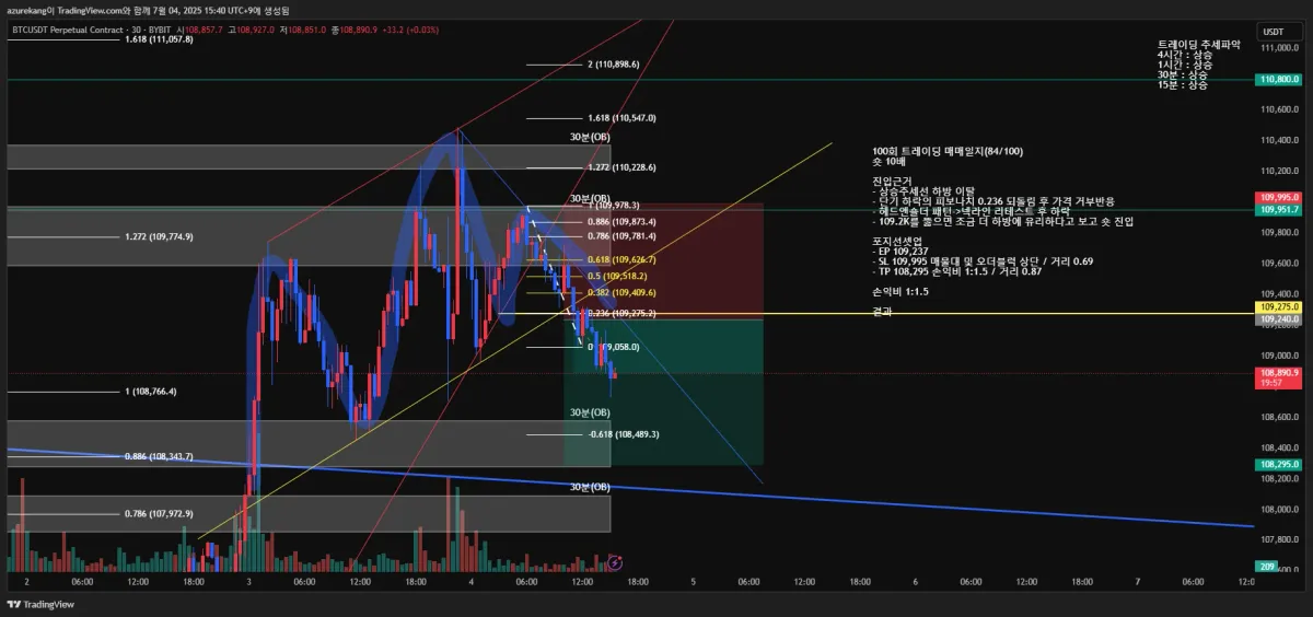 - 109.2K를 뚫으면 조금 더 하방에 유리하다고 보고 숏 진입