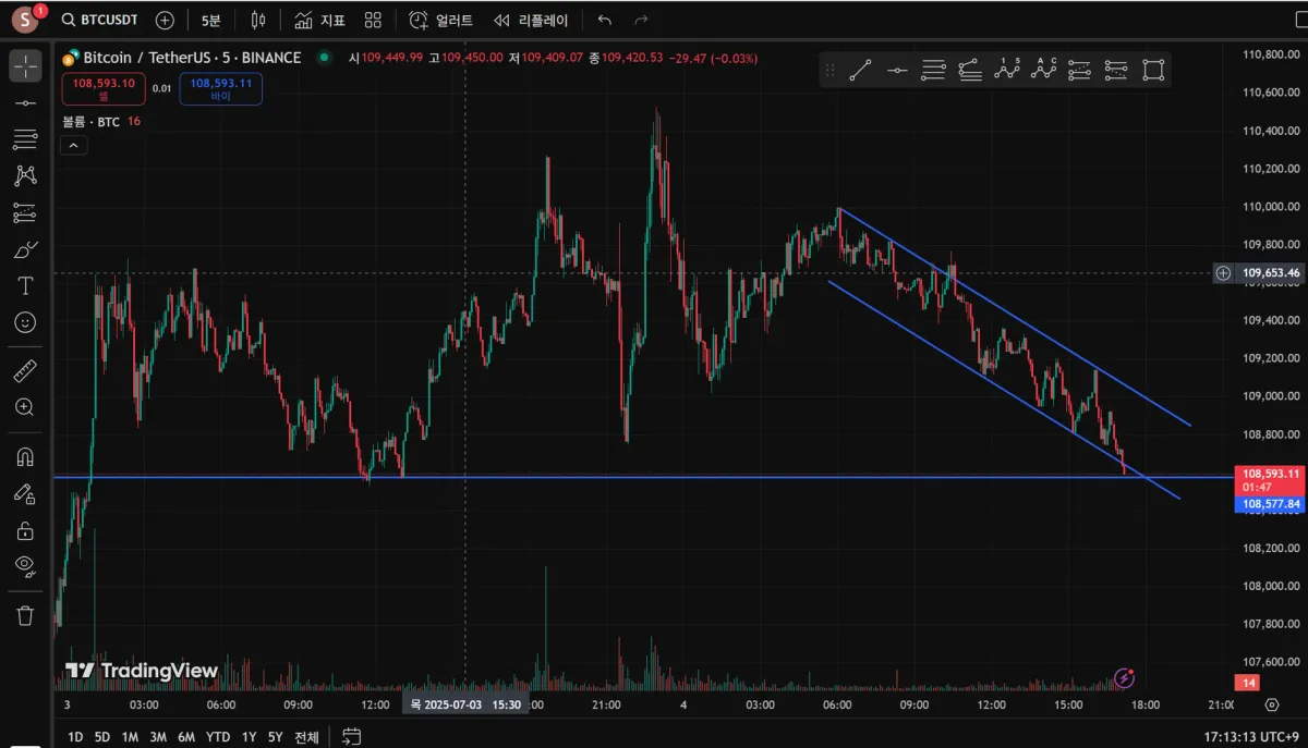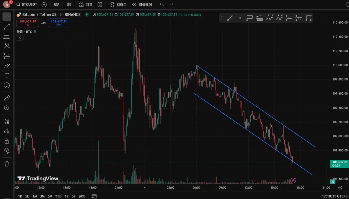 5분봉, 하락 추세의 지지, 저항선을 작도했습니다. 2선의 기울기는 동일하게 설정하였으며, 돌파를 시도하였으나, 다시 큰 낙폭으로 저항선 안으로 진입, 이후 작도해둔 선을 돌파 시도하고 있습니다.