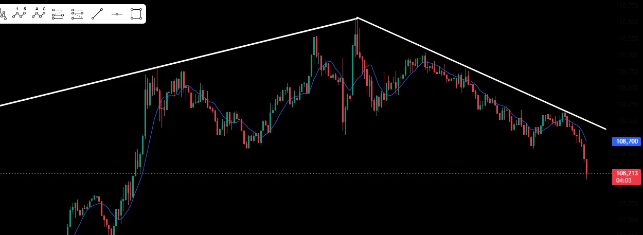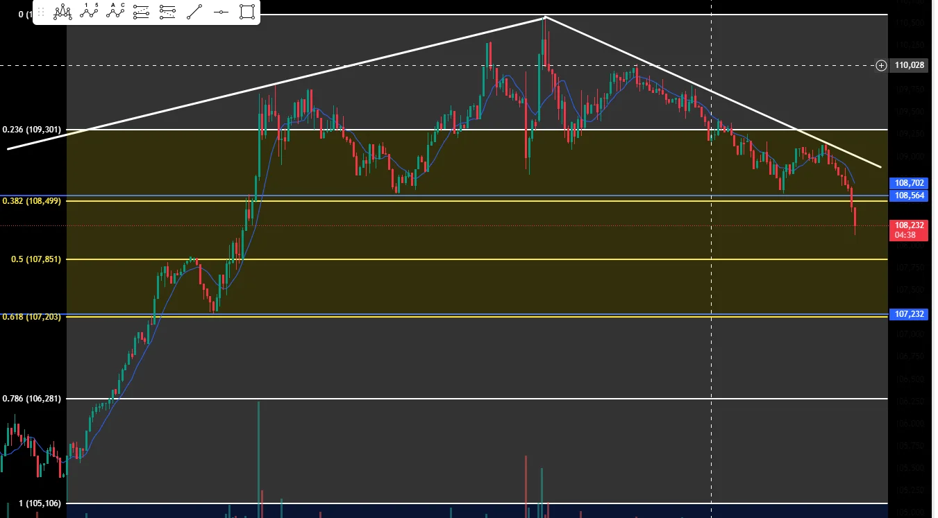 1)2)3)4)을 통해 엘리어트 코렉션 파동c 지점을 108,541로 본다면 상승이 일어나기는 했지만 금방 추세를 따라 하락한 것으로 보이고