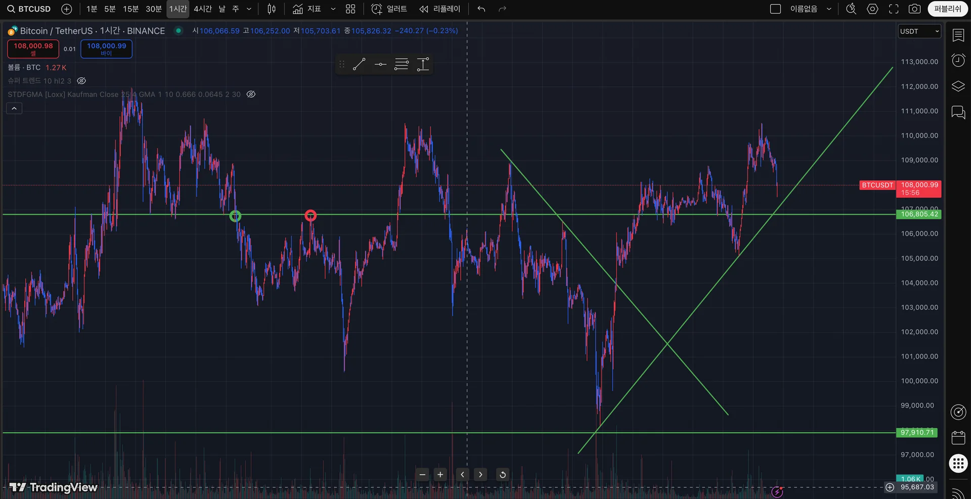 맨 오른쪽의 추세선은 현재 진행중인 상태로 지지를 받는 자리인지 확인을 해봐야 할것 같습니다.
