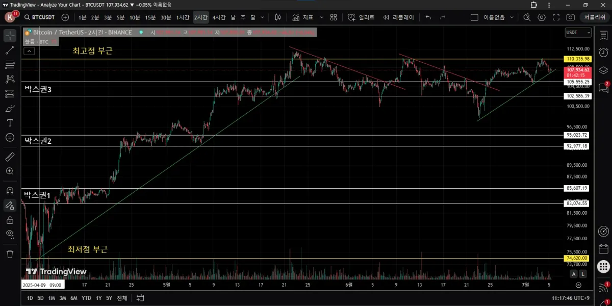 비트코인 2시간 봉으로, 4월 9일에 상승하기 시작한 때부터 지금까지를 한 화면에 담아 봤습니다.