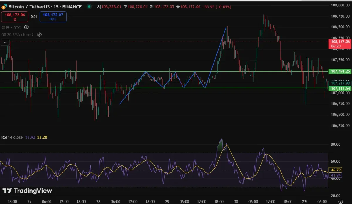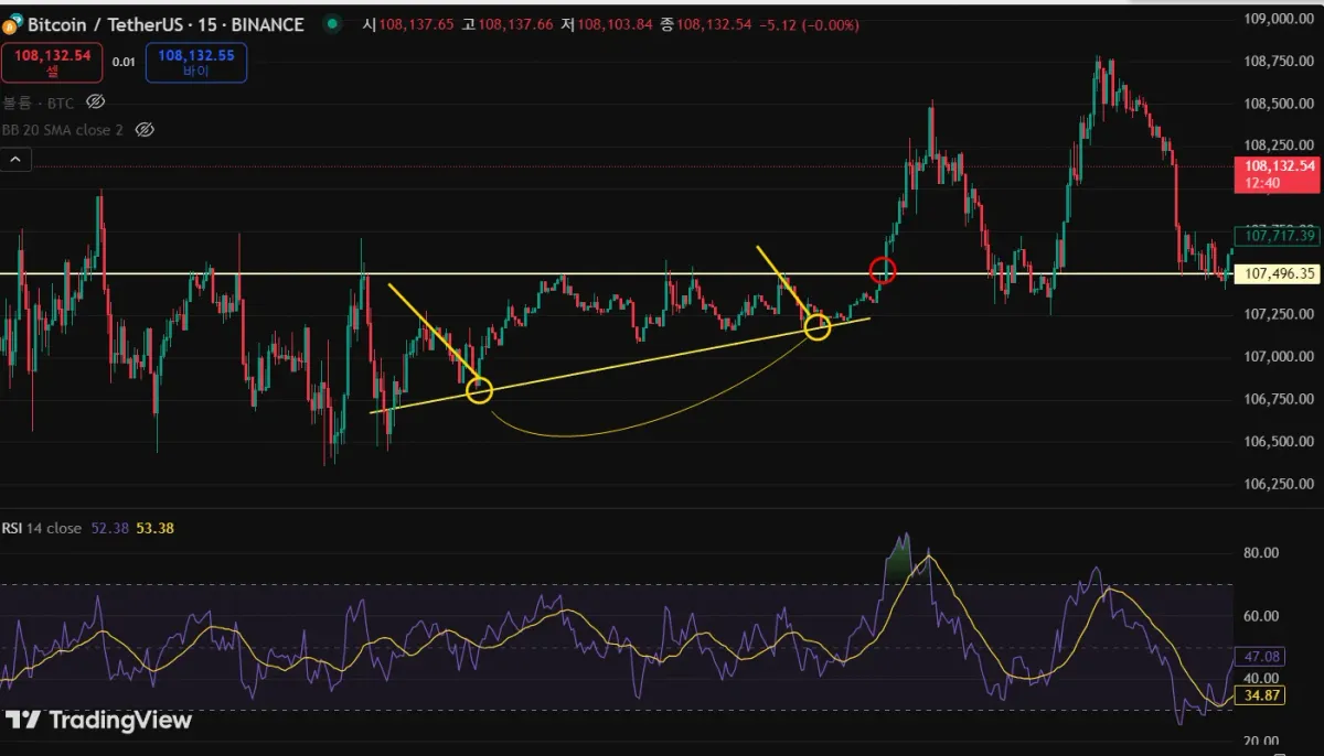 두 번째 사진도 동일한 15분봉 차트입니다. 궁금한 것은 5분, 1시간봉에서 자주 출현하는 bull 플래그 패턴으로 봐도 되는지 알고 싶습니다.