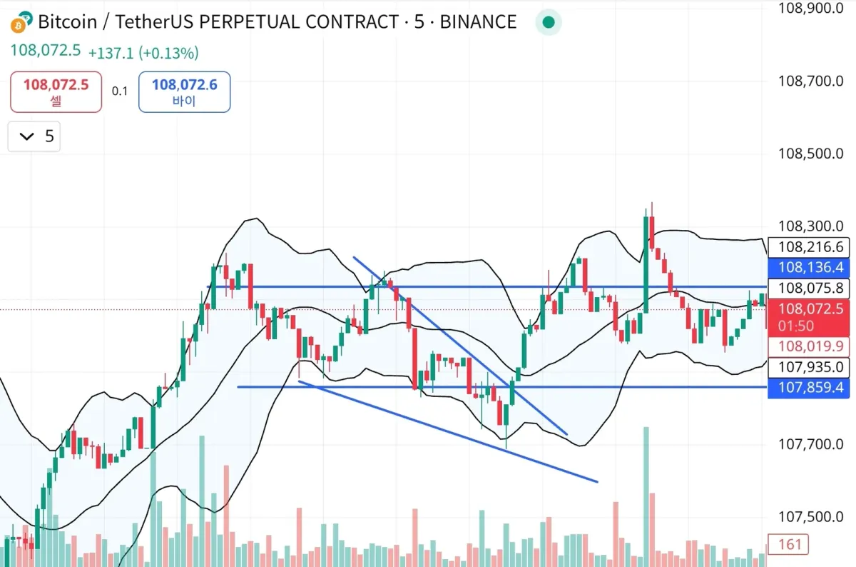 하락쐐기형 패턴 돌파시 롱 매수 볼린저 밴드 상단 이탈시 청산 짧게 단타목적으로 진입했습니다.