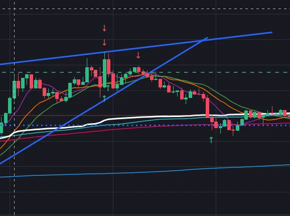 라이징 웻지?라고 하던가요 상승쐐기형 패턴이라 생각해서 숏 포지션으로 들어간 후 1차 분할 익절 후 2차 익절 상황을 기다려보고 있습니다