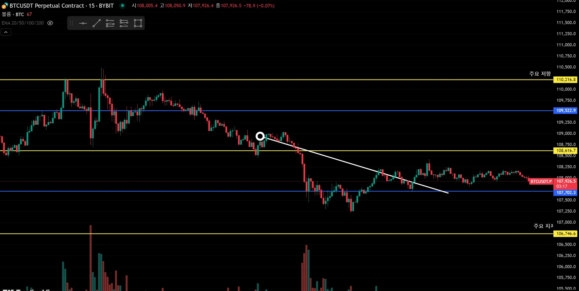 -$107,500~107,800 : 직전 지지 매물대, 거래량 수반된 반등 이력