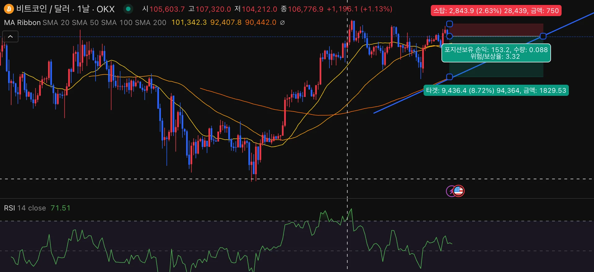 이평선 라인과 저항선 라인을 고려하여 타겟, 스탑을 설정했습니다.