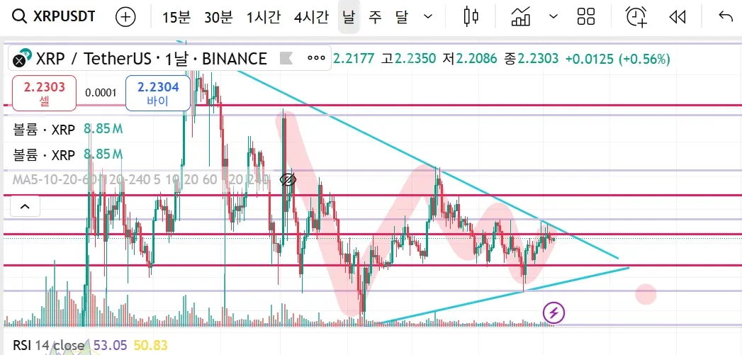 붉은색 지지 저항사이에서 왔다갔다 장대양봉으로 뚫었다가 다시 하락하며 쐐기패턴으로 흘러가는중