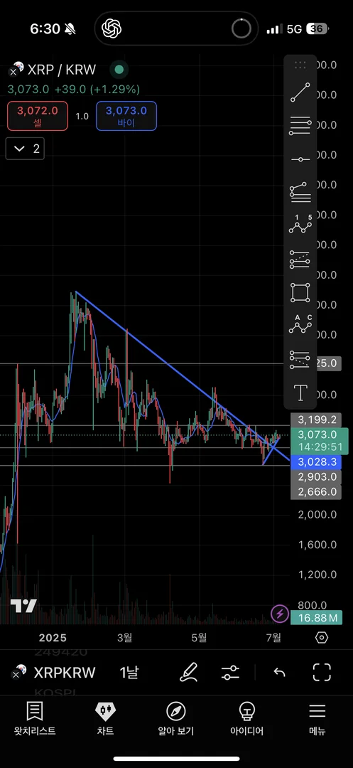 리플 4시간봉 차트로 하락추세선을 그려본 후