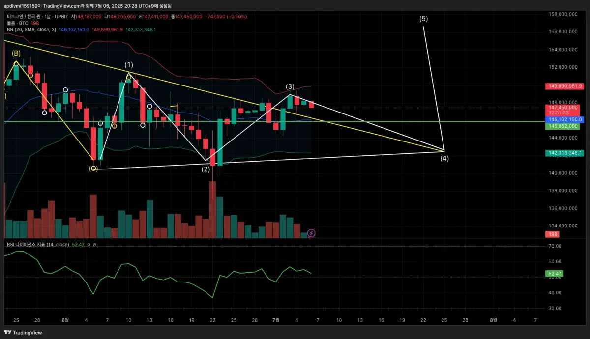 - 삼각수렴을 굉장히 중요한 틀로 보고 있는데, 삼각수렴 작도해둔 지점과, (3)번 파동 사이에 집입하였습니다.