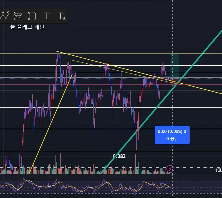 앨리어트 파동보니 대파동 5파 그중에서 중파동 3파 진입 중인 것으로 개인적으로 생각해 롱포지션을 잡았습니다 추가로 불 플래그 패턴 형성과 저점과 고점을 높여 하락 추세선을 돌파했기 때문에 롱 포지션으로 진입해봤습니다.