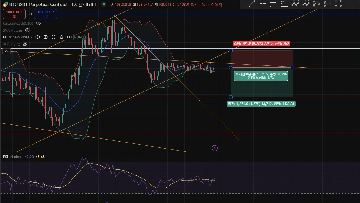 차트 분석 : 횡보 중이나 1시간 봉을 봤을 떄 하락 추세이고 4시간 봉의 피보나치 0.5가 강력한 저항선으로 보여 타겟으로 설정함.