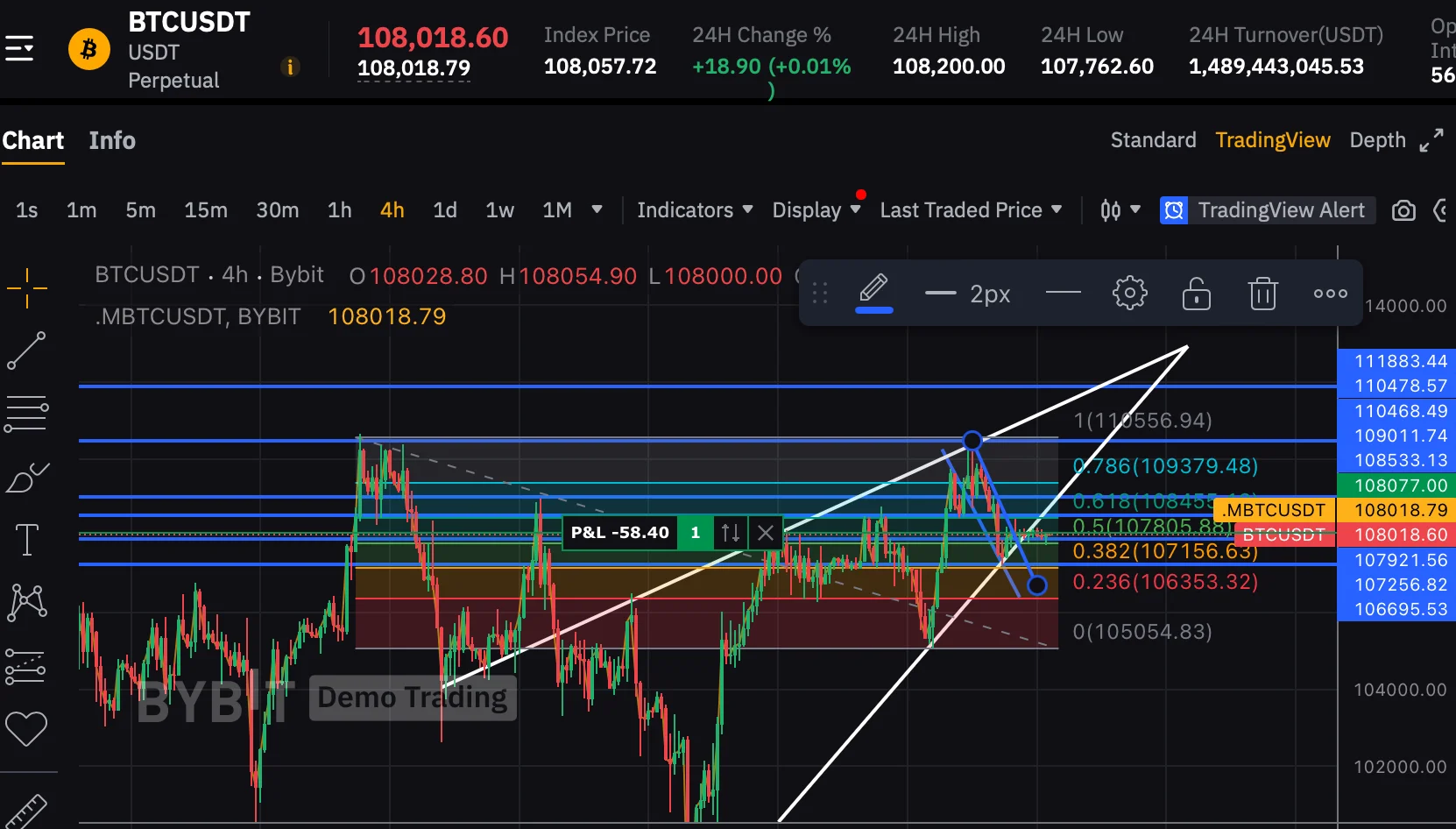108077에 진입한 이유는 추세선 상단을 돌파했고, 캔들이 삼각수렴 안에서 유지되며 상승 가능성이 있다고 판단했기 때문입니다.