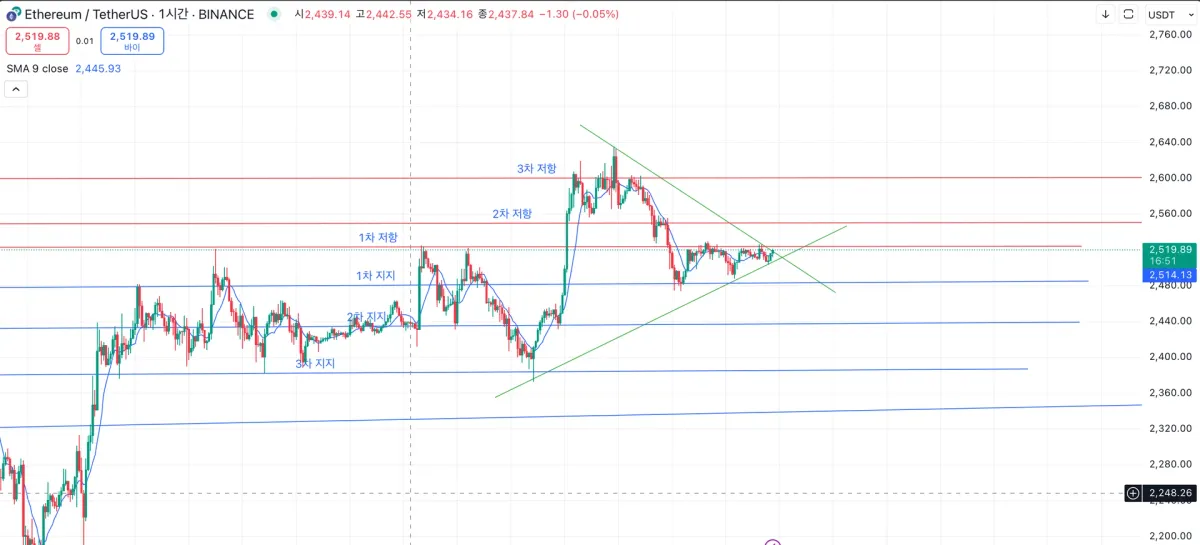 현재 초록색 윗쪽 추세선과 1차 저항이 만나고 있는데, 1차 저항을 뚫게 된다면 단기적으로 아래쪽 추세선에 닿았다가 올라갈 것으로 보인다.