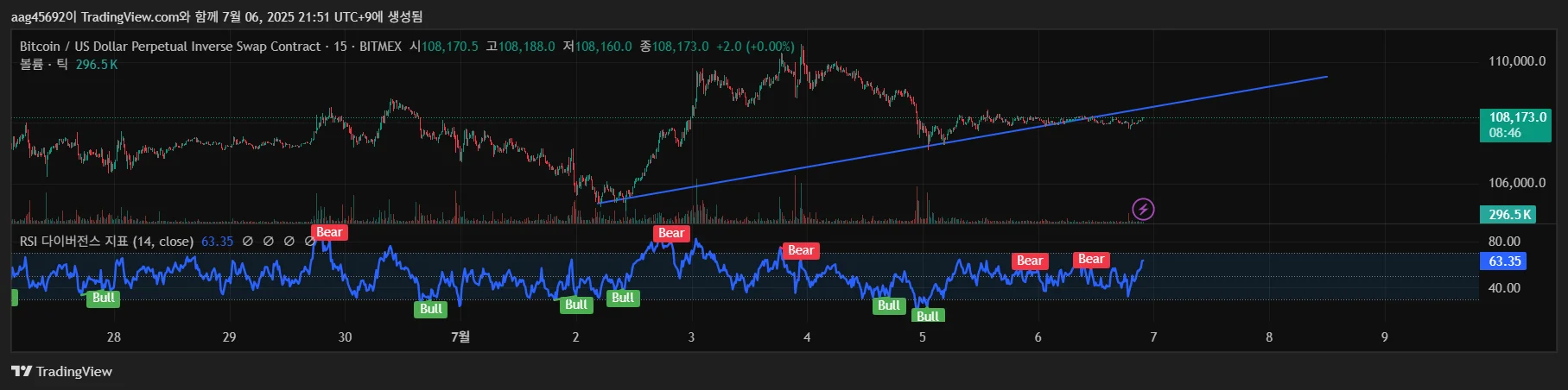추세선을 기반으로 108,173에서 지지를 받을 것으로 예상하고 진입. 5일의 저점이었던 107,174를 손절로 설정하고 아직은 관찰중에 있음.