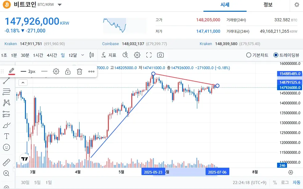 비트코인 일봉으로 파랑은 상승 추세선, 빨강은 하락 추세선이다. 가격이 상승 추세선에 닿을 경우 지지를 받아 올라가고, 하락 추세선에 닿을 경우 저항을 받아 내려가는 경향을 보인다.