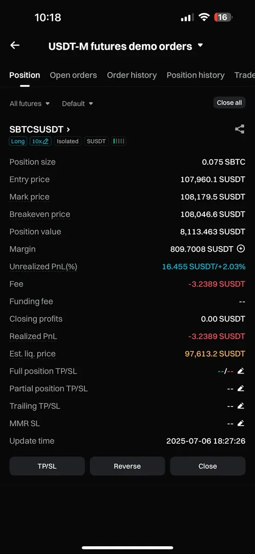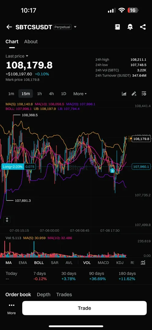차트 기준으로 가격이 이전에 볼린저 밴드 하단(약 107,794 USDT) 근처에서 반등한 흐름이 있었고, 다시 한 번 해당 지점에서 강한 매수세가 유입되는 모습이 포착되었습니다. 이를 통해 단기적인 지지선 형성이 기대되어 롱 포지션에 진입하였습니다.