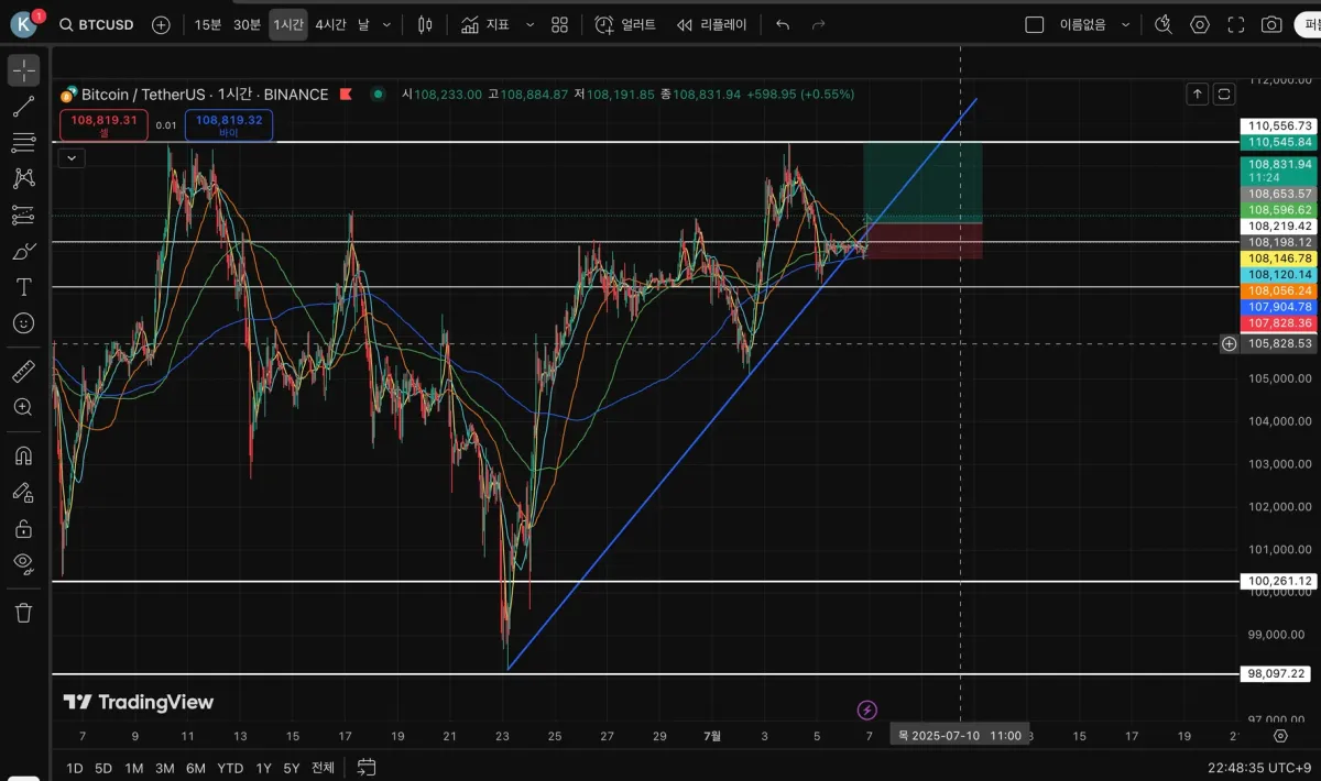 저항선과 추세선을 강하게 돌파해 지지를 받으며 전 지지선에 손절라인 정해봤습니다