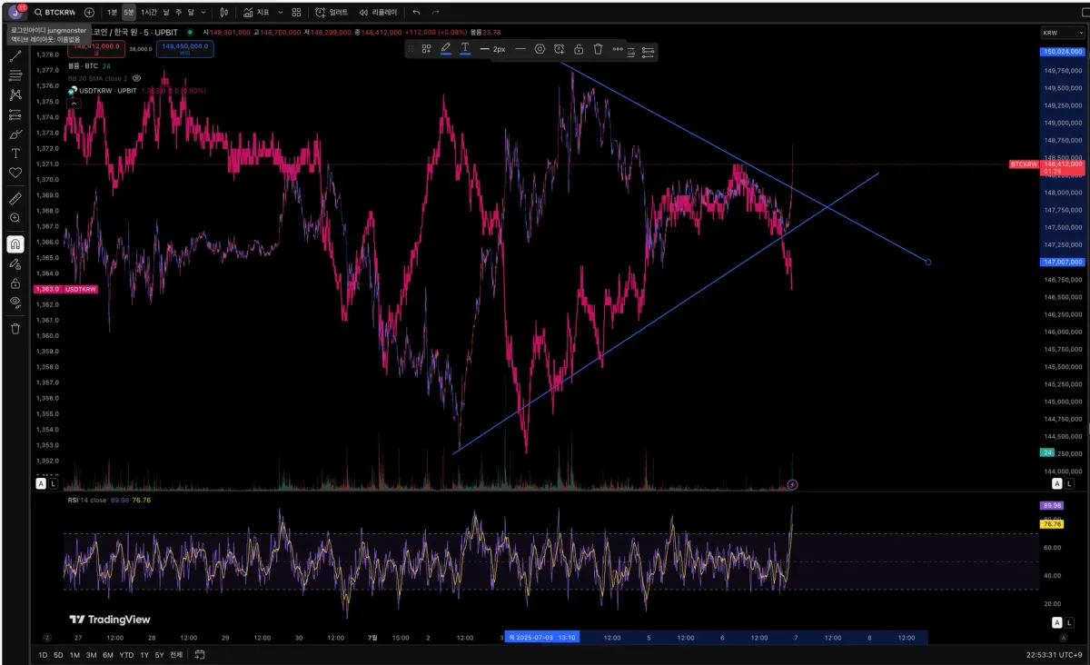 USDT는 btc와 반대로 가는 경우가 많기 때문에 현 시점을 USDT를 구입하고 USDT 가 오르면 매도 해서 최소 손해로 성공 횟수를 늘리는 전략으로 진행해보려고 합니다.